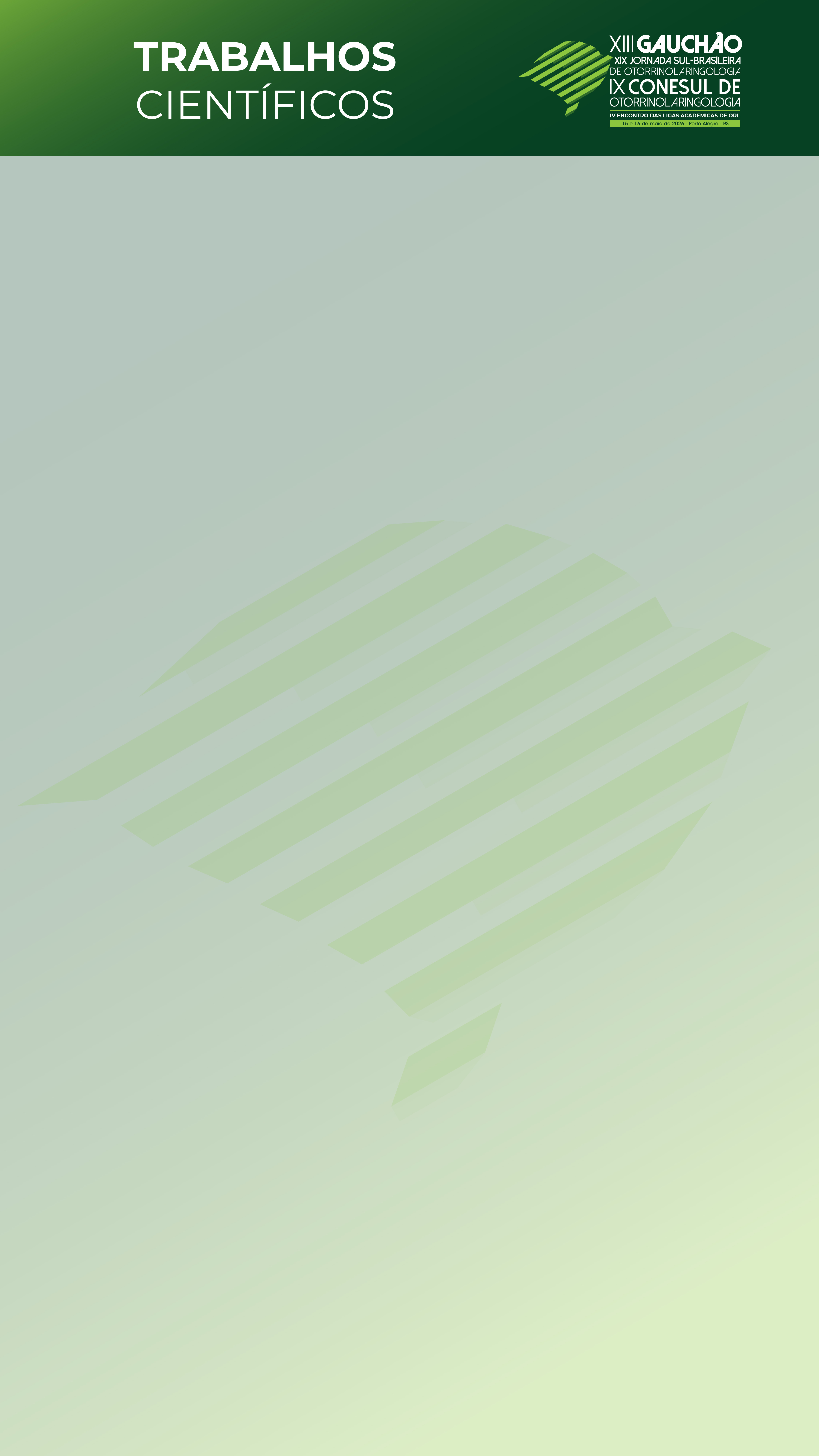 - Utilizar o topo padrão fornecido com a identidade visual do XIII Gauchão, XIX Jornada Sul-Brasileira de Otorrinolaringologia, IX Conesul de Otorrinolaringologia, IV Encontro Acadêmico das Ligas de ORL;